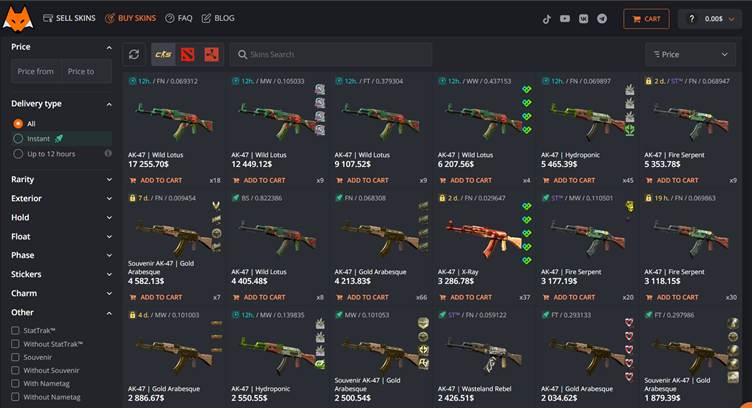 - Large selection of AK-47 skins — from budget options to rare collector items